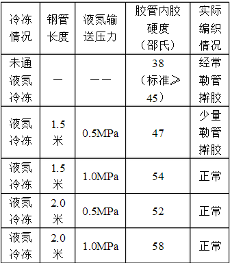 確定了采用液氮冷凍技術,我廠開始設計冷凍段。以編織膠管為例,每根膠管可長達100米左右,為了提高冷凍效果,我們采用長的鋼鐵管道作為液氮流入、輸出膠管渠道,兩端管口使用海綿封堵,減少液氮的流失。確定冷卻段后,進行冷凍試驗,并進行檢驗,選用**佳方案。試驗結果如表二: